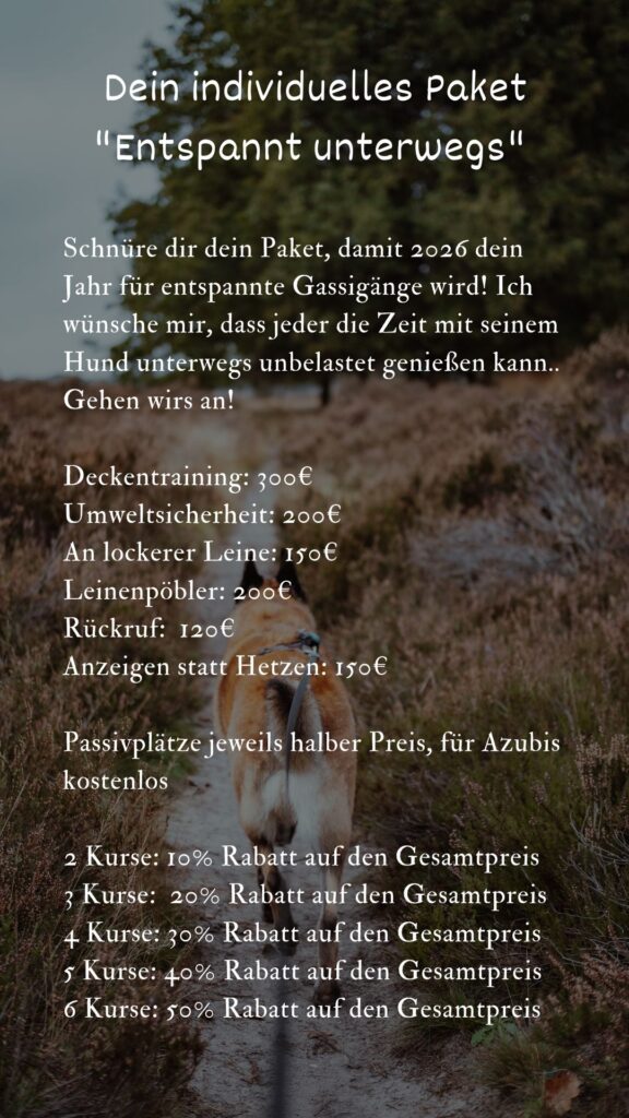 Du setzt mit meiner Anleitung viele verschiedene Impulse um und wir besprechen, welche für deinen Hund hilfreich sind. Scheu dich nicht davor, mit mir im Januar zu starten! Einige Übungen wie z.B. isometrische Übungen wirst du zunächst zuhause umsetzen. Wir haben in der kalten Jahreszeit auch den großen Vorteil, dass manche Hundehalter lieber auf der Couch sind und dein Hund dadurch draußen weniger Reizen ausgesetzt ist.